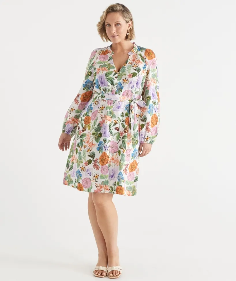 In a fresh new shape, our Linen Floral Botanical Long Sleeve Dress features our gorgeous botanical print of the season. Front panel detailing with a matching belt to define the waist. This flattering silhouette is finished with gold-rimmed buttons for added detailing.