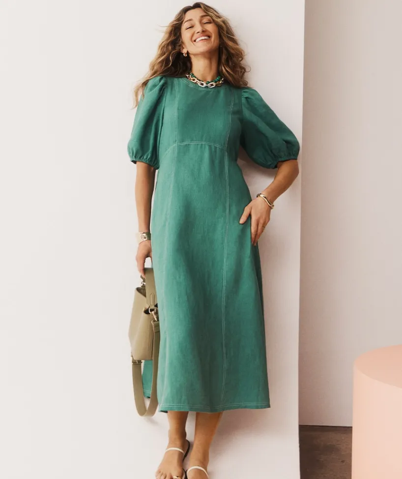 Our Linen Stitch Detail Short Sleeve Midi Dress is crafted from breathable linen and based on a best-selling silhouette. Designed with feminine short sleeves with elasticated openings for all-day comfort, and eye-catching contrast stitch along the front for added detail.