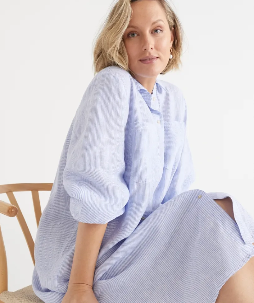 The Linen Stripe Shirt Dress is your warm-weather go-to. In 100% linen with elastic sleeve cuffs for a relaxed fit, the flattering scoop hem and classic stripe make it a timeless addition to your wardrobe.