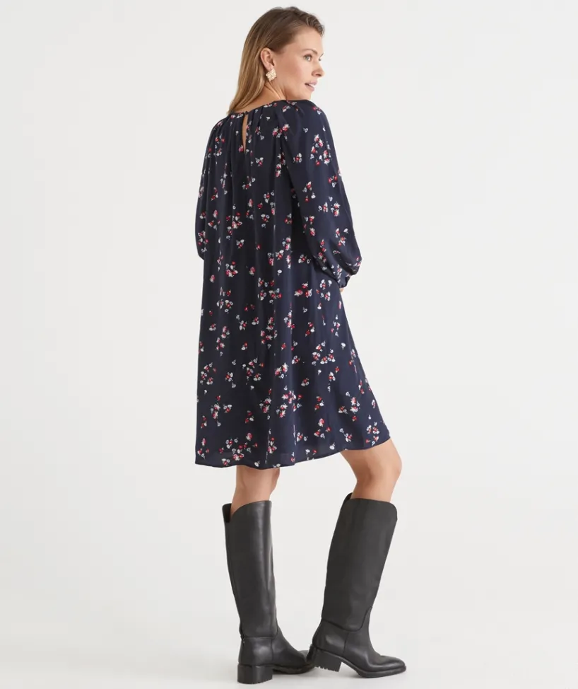 A fresh take on winter florals, this Long Sleeve Floral Shift Dress, in a modern shift silhouette with a scoop neckline and elasticated cuffs. Finished with a straight hem and button-back closure, it’s perfect for layering with tights and boots.