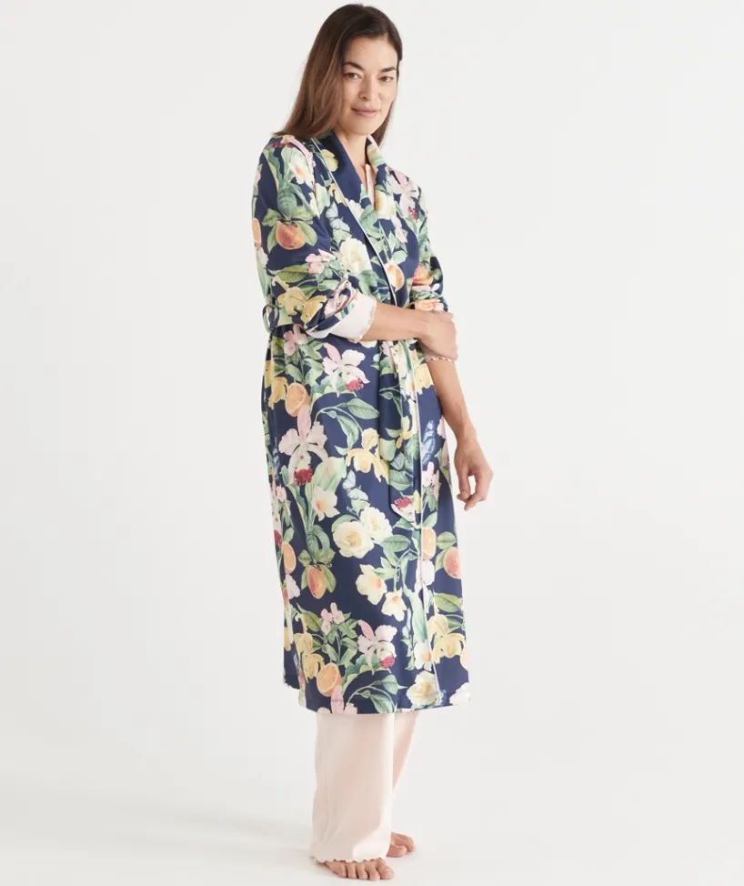 Relax in effortless elegance with our new Fruity Floral Robe. Made from a soft, breathable poly-cotton blend, it offers lightweight comfort with a luxurious drape. Featuring a Sussan exclusive fruity floral print, this vibrant design adds a fresh, playful touch. The relaxed fit, wide sleeves, and matching tie belt create a flattering, stylish silhouette—perfect for lounging in style, morning or night.