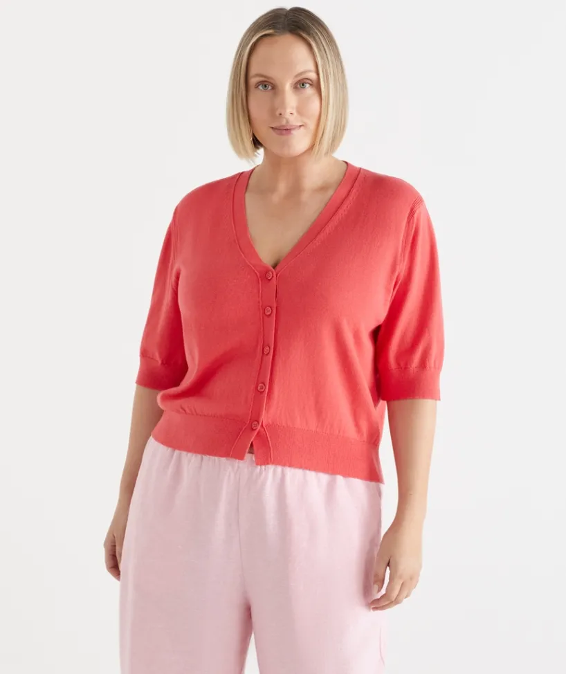 The Knit Short Sleeve V Neck Cardigan has been made with a cotton blend. This fully fashioned knit has a v neckline, button fastening, short sleeves and rib trims. The perfect addition to your wardrobe.