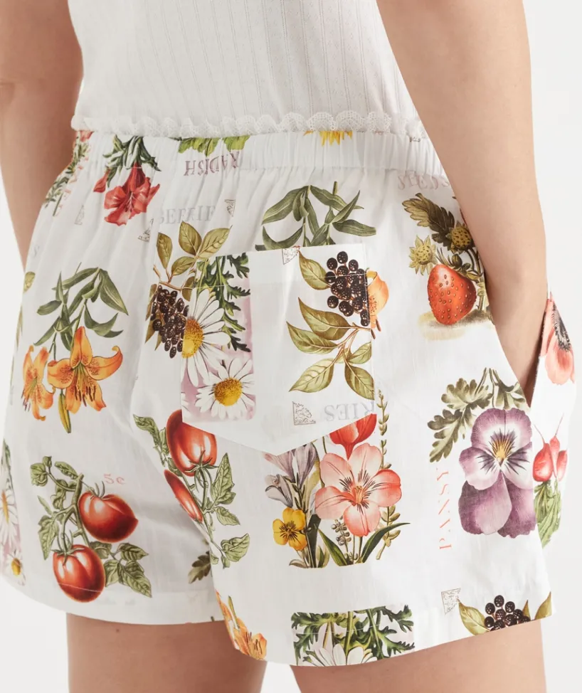 Relax in style with the Garden Stamp Print Pyjama Boxer Short, crafted from breathable 100% textured cotton for a soft, natural feel. Featuring a Sussan exclusive floral stamp print and delicate lace detailing, these boxers offer a comfortable, relaxed fit with an elastic waistband for easy wear.