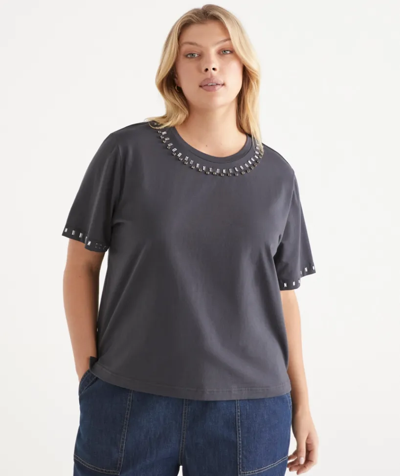 Introducing our Embellished Short Sleeve Tee. Crafted from 100% Australian Cotton, it is the perfect edition to your wardrobe. Designed to work for all aspects of dressing including day to night featuring a hand applied jewel embellishment in a wearable slate colour. Pair back with denim, black pants or with your favourite skirt for effortless appeal.