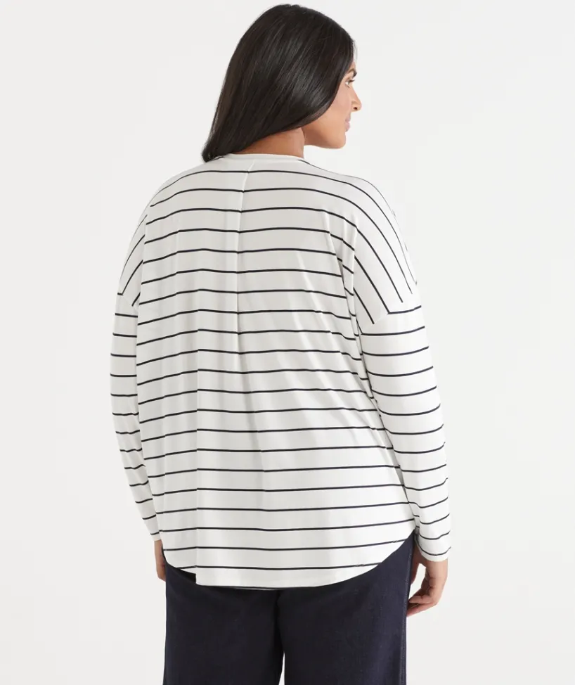 Introducing the Long Sleeve V Neck Stripe Pleat Back Tee. The everyday top that’s here to elevate your wardrobe. This drop shoulder, loose fit top is the perfect addition for those looking to achieve effortless style through layering. Featuring pleat back detailing and long sleeves for the cooler weather.
