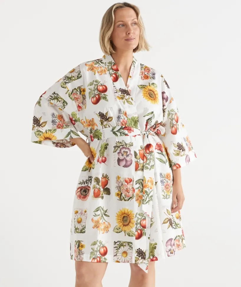 Elevate your everyday with the Garden Stamp Print Robe, featuring a Sussan exclusive floral stamp print. Crafted from 100% textured cotton, this robe is designed for relaxed comfort with a flattering drape and wide sleeves. The botanical-inspired stamp motif adds a fresh, artistic touch—perfect for slow mornings, cosy evenings, or simply lounging in style.