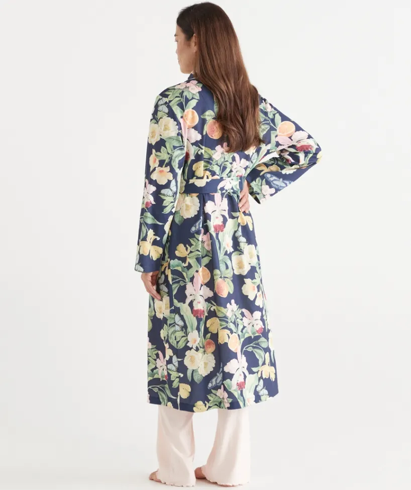 Relax in effortless elegance with our new Fruity Floral Robe. Made from a soft, breathable poly-cotton blend, it offers lightweight comfort with a luxurious drape. Featuring a Sussan exclusive fruity floral print, this vibrant design adds a fresh, playful touch. The relaxed fit, wide sleeves, and matching tie belt create a flattering, stylish silhouette—perfect for lounging in style, morning or night.
