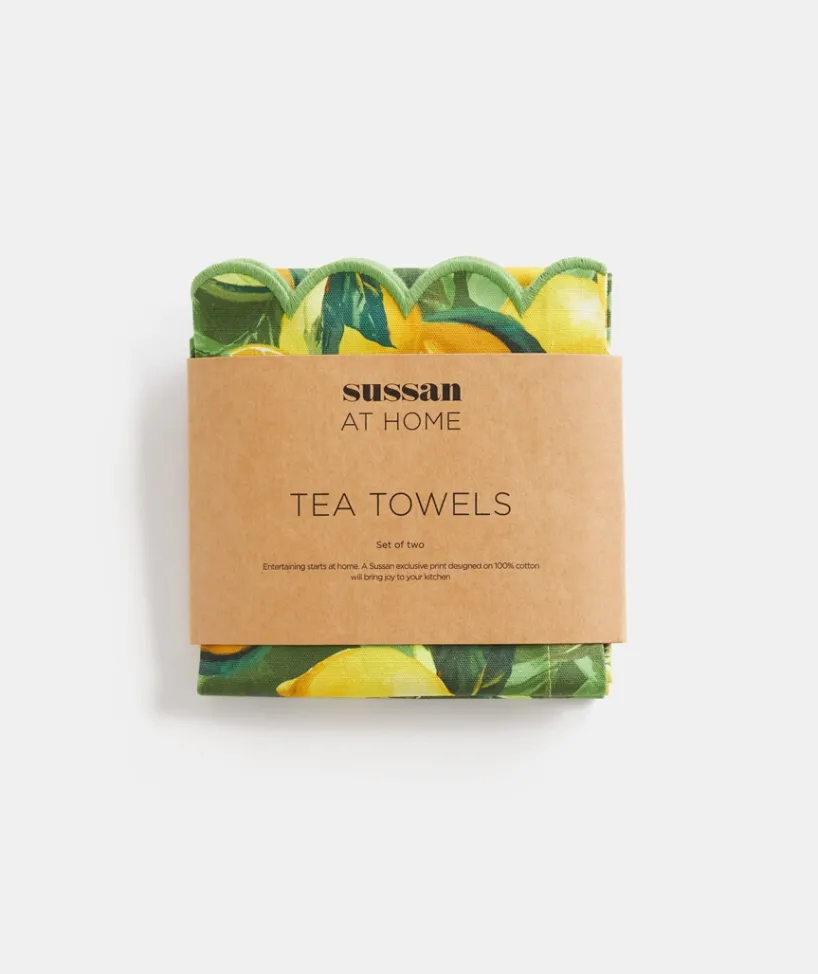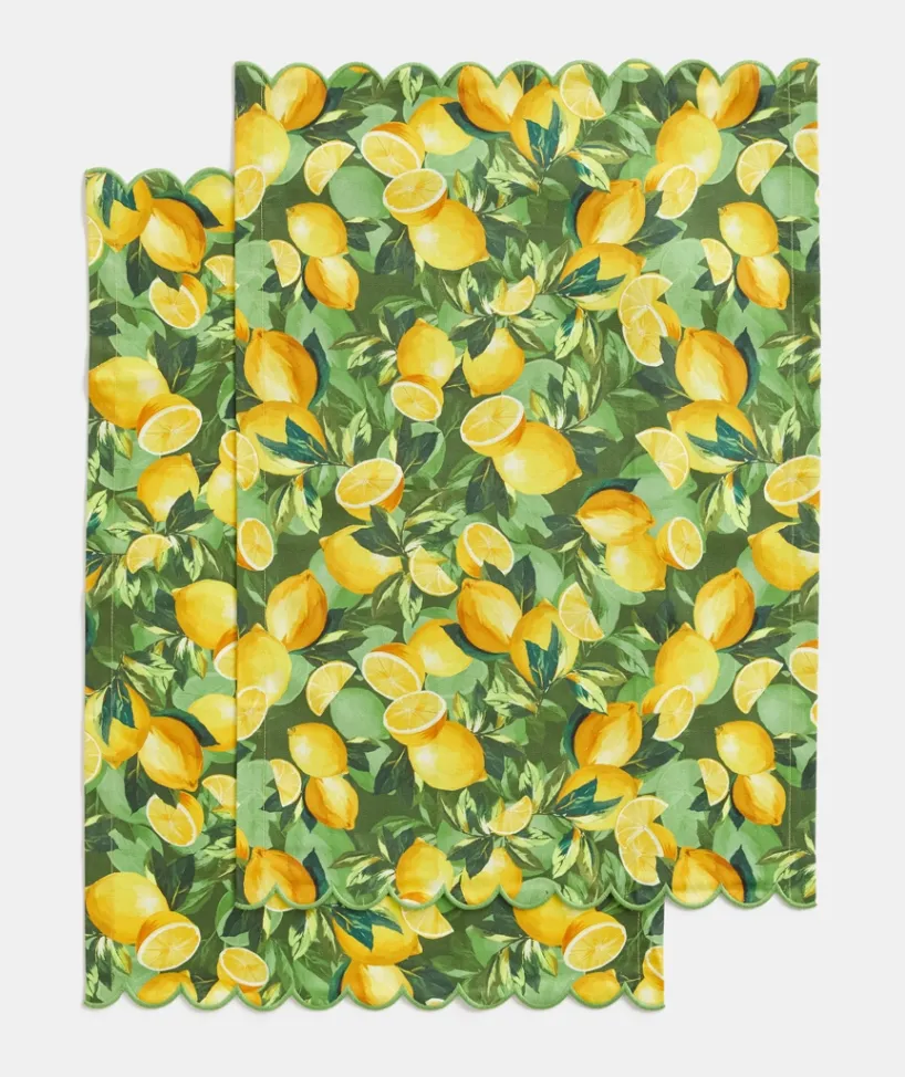 Entertainment starts at home. This set of two Sussan-exclusive Lemon Print Tea Towel Set is designed on 100% cotton to bring joy to your kitchen. Featuring a playful citrus design on a fresh green base, each towel is finished with scalloped edges for an added touch of charm. Soft, absorbent, and full of personality—perfect for everyday use or styling your space with a vibrant, uplifting look.