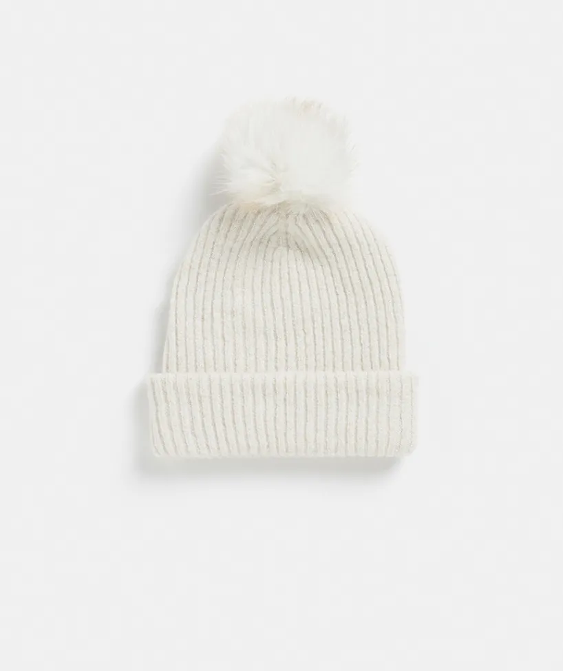 Stay warm and stylish with our new Knit Pom Pom Beanie. Crafted from a soft knit fabric infused with shimmering lurex threads, this beanie adds a subtle sparkle to your winter wardrobe. The fold-over cuff provides a snug fit, while the fluffy faux fur pom pom on top adds a playful touch.