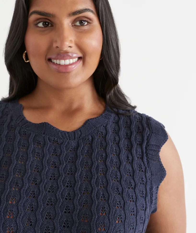 Make a statement this season with our 100% Cotton Scallop Detail Knit Tank. Coming in two striking colours, Ink and Chalk, this fully fashioned knit tank can take you from day to night. The perfect addition to your transeasonal wardrobe.